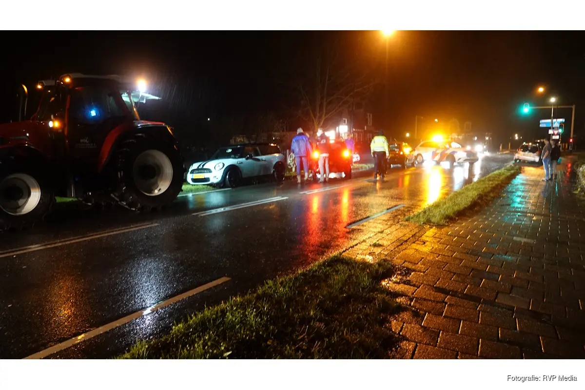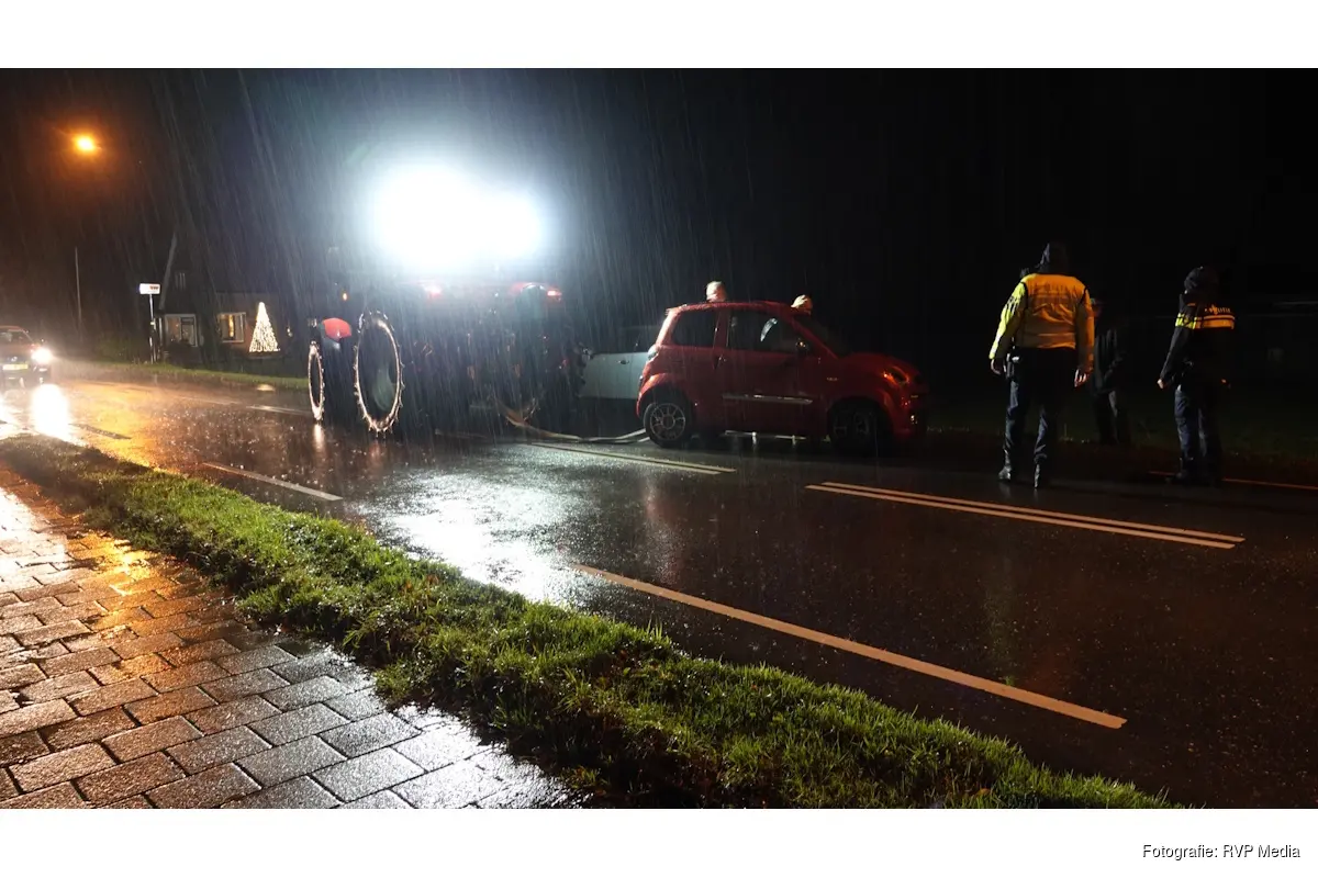 Een boer heeft de brommobiel met zijn tractor uit de sloot getrokken.