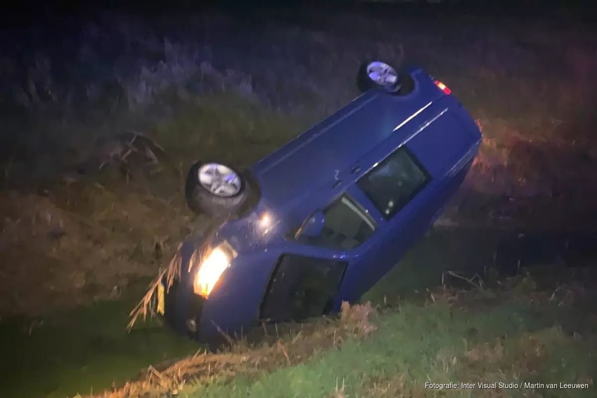 Door nog onbekende oorzaak raakte een busje van de weg. Het voertuig reed de berm in, sloeg over de kop, en belandde ondersteboven in de sloot.