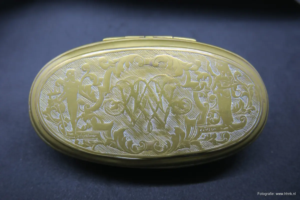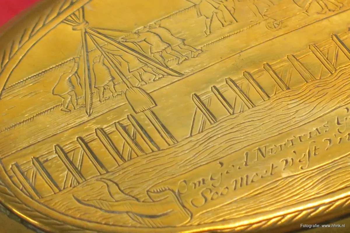 Deze tabaksdoos toont de herstelwerkzaamheden na een dijkdoorbraak. Het geeft een indruk van de mensen die gezamenlijk de schouders eronder zetten om het gat te dichten en het land weer bewoonbaar te maken. Oude scènes van dijkherstel en de mensen die hieraan werkten zijn uitzonderlijk; de tabaksdoos geeft dan ook een uniek inkijkje in de mensen die zich daarmee bezighielden. Op het deksel aan de voorzijde staan de goden Neptunes van de zee en Ceres van de landbouw afgebeeld naast een monogram van ineengevlochten letters.