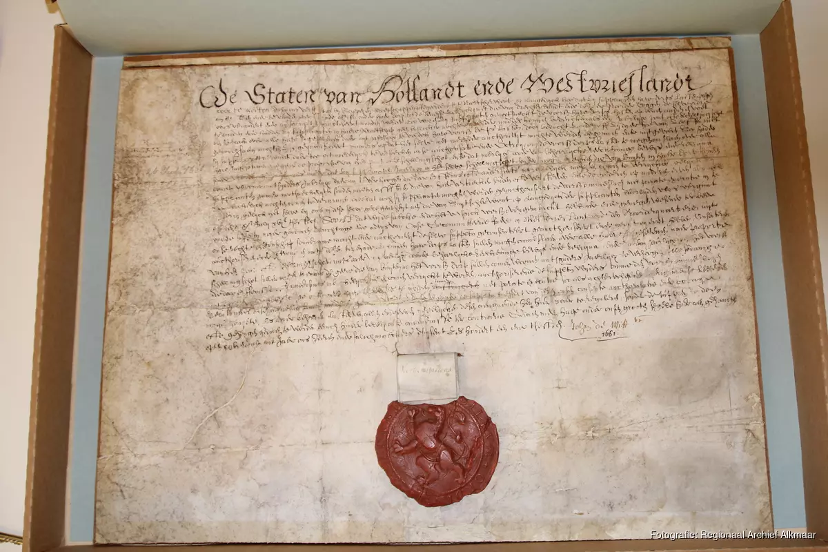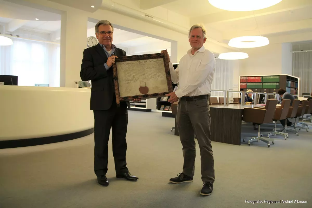 ALKMAAR – Het Regionaal Archief ontving 23 oktober een bijzondere schenking van de Stichting Langedijker Verleden. Het betreft een charter (perkamenten oorkonde) uit 1661, ondertekent door de beroemde raadspensionaris Johan de Witt.
