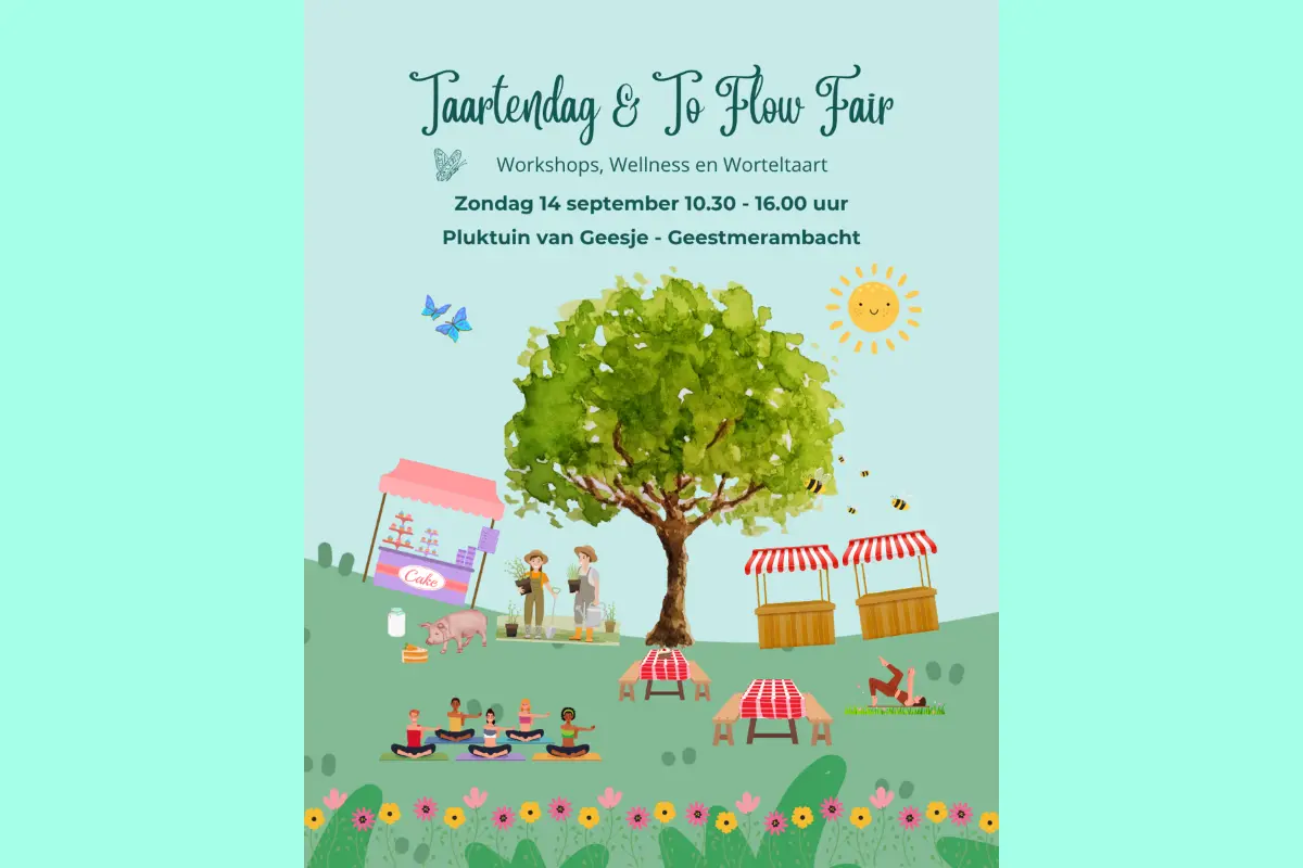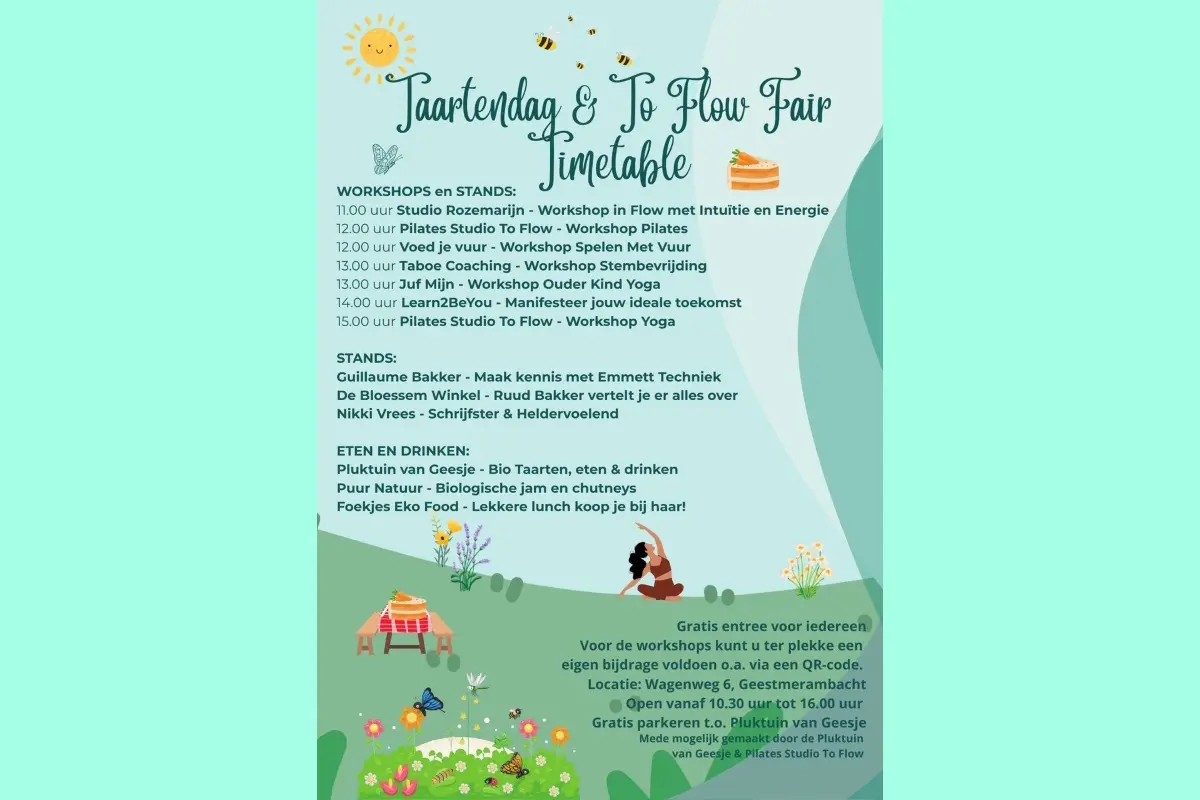 Wil je deelnemen aan een van onze unieke workshops? Verzeker jezelf van een plekje, kom op tijd! Of je nu komt voor de taart, de workshops, of gewoon om te genieten van de sfeer, de "Taartendag & To Flow Fair" belooft een dag te worden waarop welzijn, plezier en gemeenschapsgevoel hand in hand gaan. Mis deze kans niet om deel uit te maken van een dag die zowel het lichaam als de geest voedt. We kijken ernaar uit je te verwelkomen in de Pluktuin van Geesje voor een dag die je zintuigen zal prikkelen en je hart zal verwarmen.