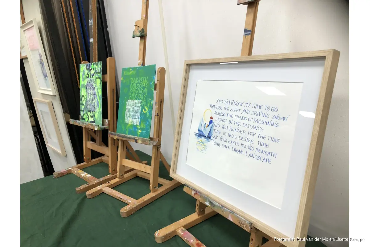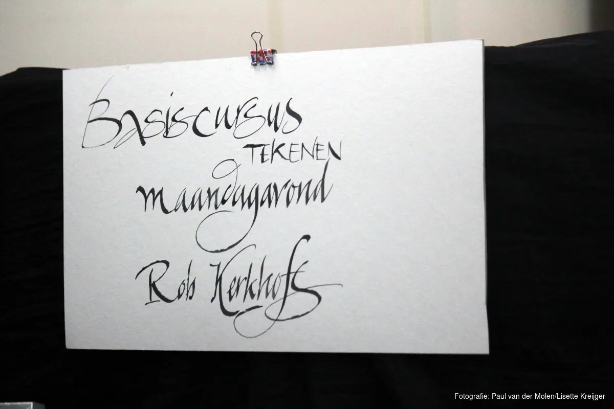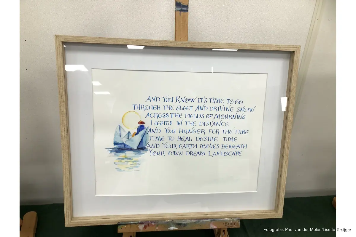 Schilderen/tekenen (surrealistisch, realistisch of intuïtief), grafische technieken zoals linoleumdruk of houtsnede, fotografie – lightroom CC en Tiffany: om maar een greep te doen uit het aanbod. Wil je leren quilten? Lijkt het je wat om een roofvogel te maken in een legering van lood en tin? Of denk ook eens aan iets schrijven in kalligrafieschrift: “Kalligrafie stamt uit vroege beschavingen en is duizenden jaren oud, ook in oude manuscripten gebruikt”, zo weet letterkunstenaar Margreet Wanst te vertellen. Keramist Pauline Kokmeijer vult aan: “Pottenbakken is sinds corona écht booming. Het is de populairste cursus!” Bezoeker Cor ziet zijn kans schoon en maakt kennis met deze discipline. “Heel leuk om dat eens daadwerkelijk te proberen, met tips van een ervaren pottenbakster”, zegt hij. Kortom: van oude ambachten tot modern fotografiewerk. Chat GTP, daar zijn ze hier niet zo van, het wordt slechts gebruikt als hulpmiddel.