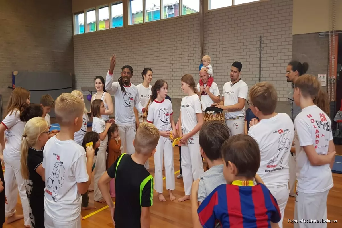 Ondanks de regen was aan de feestelijke slinger duidelijk te zien waar de Open Dag van CN capoeira plaatsvond. Drie docenten stonden klaar om de kinderen tussen de 4 en 12 jaar les te geven. Na een gezamenlijke start werd de groep in leeftijd verdeeld. Het was een feest om iedereen zo bezig te zien. Met het eind spel, de "roda" kwamen de kinderen weer bij elkaar om in te zetten wat ze hadden geleerd en natuurlijk deden de docenten ook mee!
