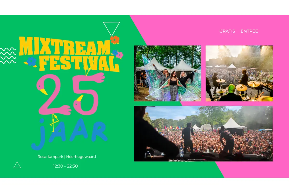 Mixtream Festival 2025 is er op zondag 24 augustus in het Rosarium Park in Heerhugowaard. Met ons 25 jarige bestaand! De entree is gratis voor alle leeftijden. Om 12:30 uur gaat het festival open en om 22:30 uur is het evenement afgelopen. Je kunt bij de bar drankjes halen en eten kan bij de diverse eetkraampjes. Let op: Mixtream is pin-only.