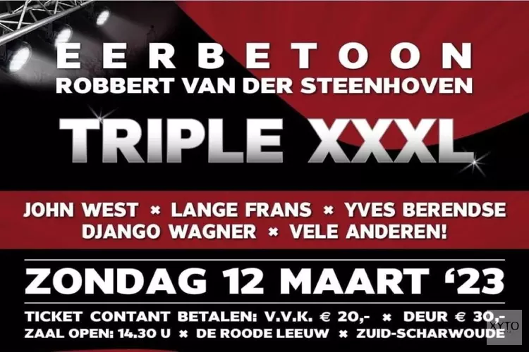 ZUID-SCHARWOUDE - Zondag 12 Maart wordt er een eerbetoon "Triple XXXL" aan de vorig jaar overleden Robbert van der Steenhoven georganiseerd in Cafe De Roode Leeuw in Zuid-Scharwoude. Vele jaren heeft Robbert met zijn zelf verzonnen concept "Triple X" opgetreden in Marlène te Heerhugowaard en De Roode Leeuw in Zuid-Scharwoude met toppers zoals Andre Hazes, Tino Martin, Mart Hoogkamer, Peter Beense, Frans Duijts, Henk Dissel en Rene Karst.