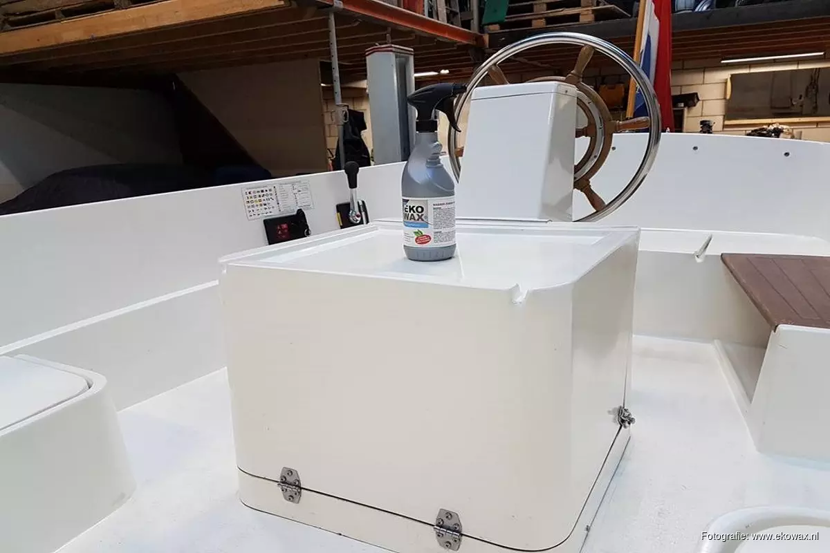De fijn vernevelde spray van Ekowax zorgt er voor dat het vuil losweekt en wordt ingekapseld, waarna het simpel en krasvrij met een microvezeldoek verwijderd kan worden van je lak, maar ook je ramen, kunststof, chroom, aluminium of wat voor niet poreuze ondergrond dan ook. Met een 2e doek wrijf je nog even licht na voor een streep- en vlekvrij resultaat en heb je gelijk de boot voor enkele maanden in de wax staan. Gemiddeld hoeft zo’n klusje nog geen half uur te kosten.